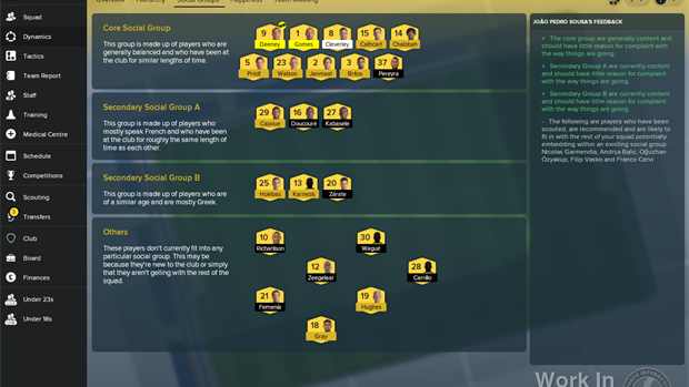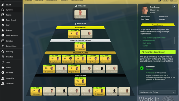 Dynamics – A harmonious squad produces better results on the pitch. By building partnerships amongst your players – both on and off the pitch – and maintaining a good dressing room atmosphere you’ll get the best performances out of your squad.